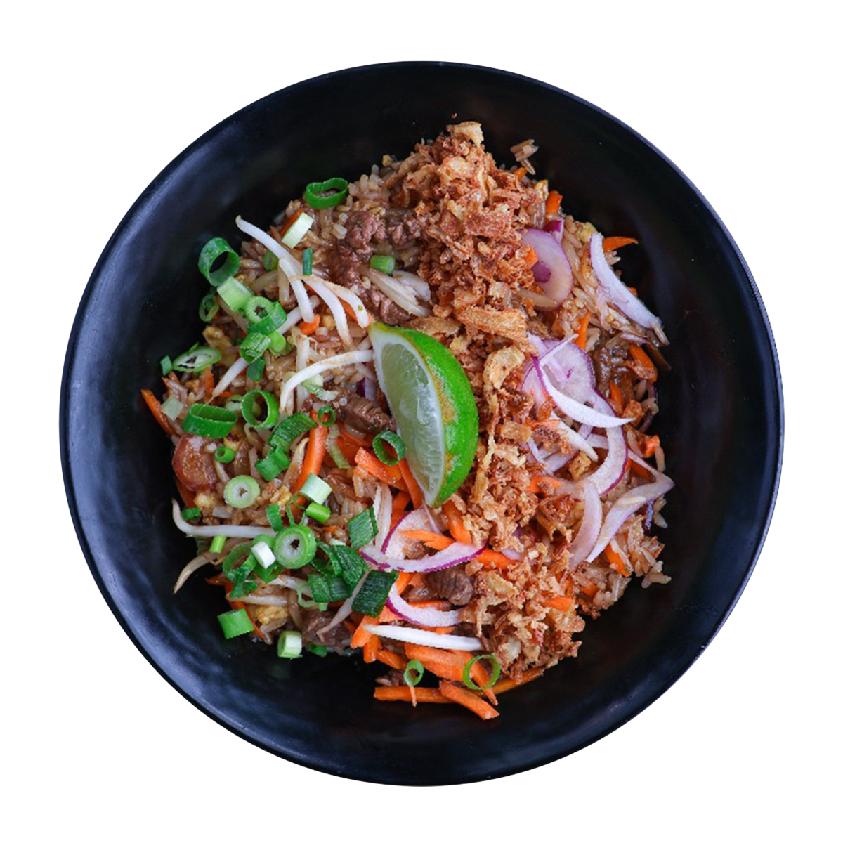 Pousses de soja, œuf, carottes fraiches, oignons rouges, piments, riz blanc parfumé sauté au wok à la sauce Tai Kin, oignons frits, ciboulette tai et cive, citron vert.