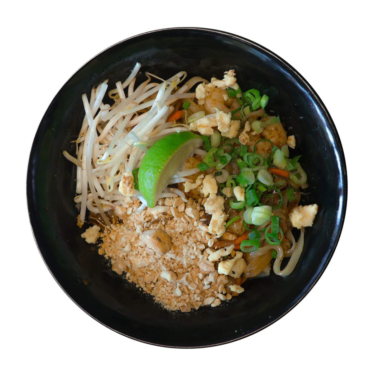 Nouilles de riz plates, pousses de soja, carottes fraiches, œuf, oignons rouges sautés au wok, noix de cajou, ciboulette tai et cive, citron vert, sauce tai kin