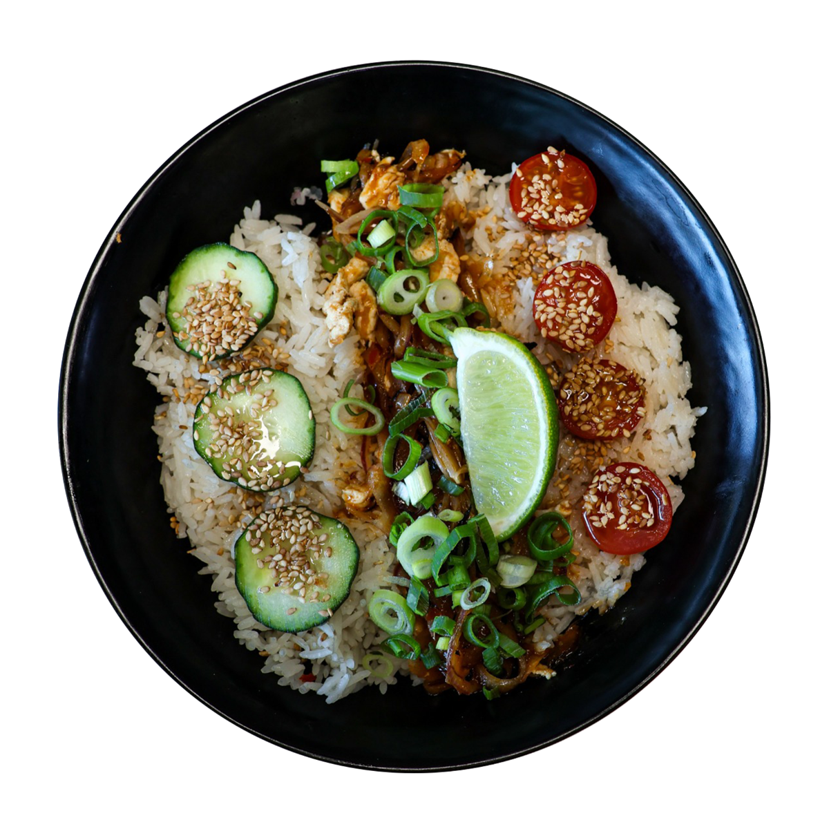 oignons rouges sautés au wok, lait de coco et sauce satay tomates et concombre frais, ciboulette tai et cive, graines de sésame torréfiés, citron vert, vinaigrette tai à l’huile de sésame, sauce chili & garlic