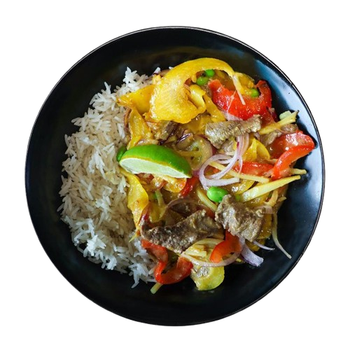 Poivrons frais, oignons rouges, pousses de bambou, fèves édamame sautés au wok, citron vert, lait de coco et sauce curry doux.
