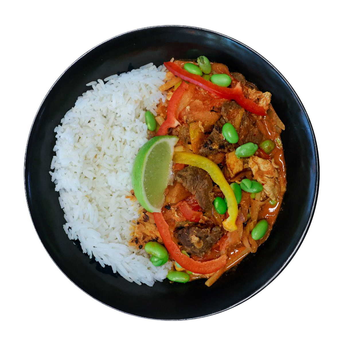Poivrons frais, oignons rouges, pousses de bambou, fèves édamame sautés au wok, citron vert, lait de coco et sauce curry rouge.