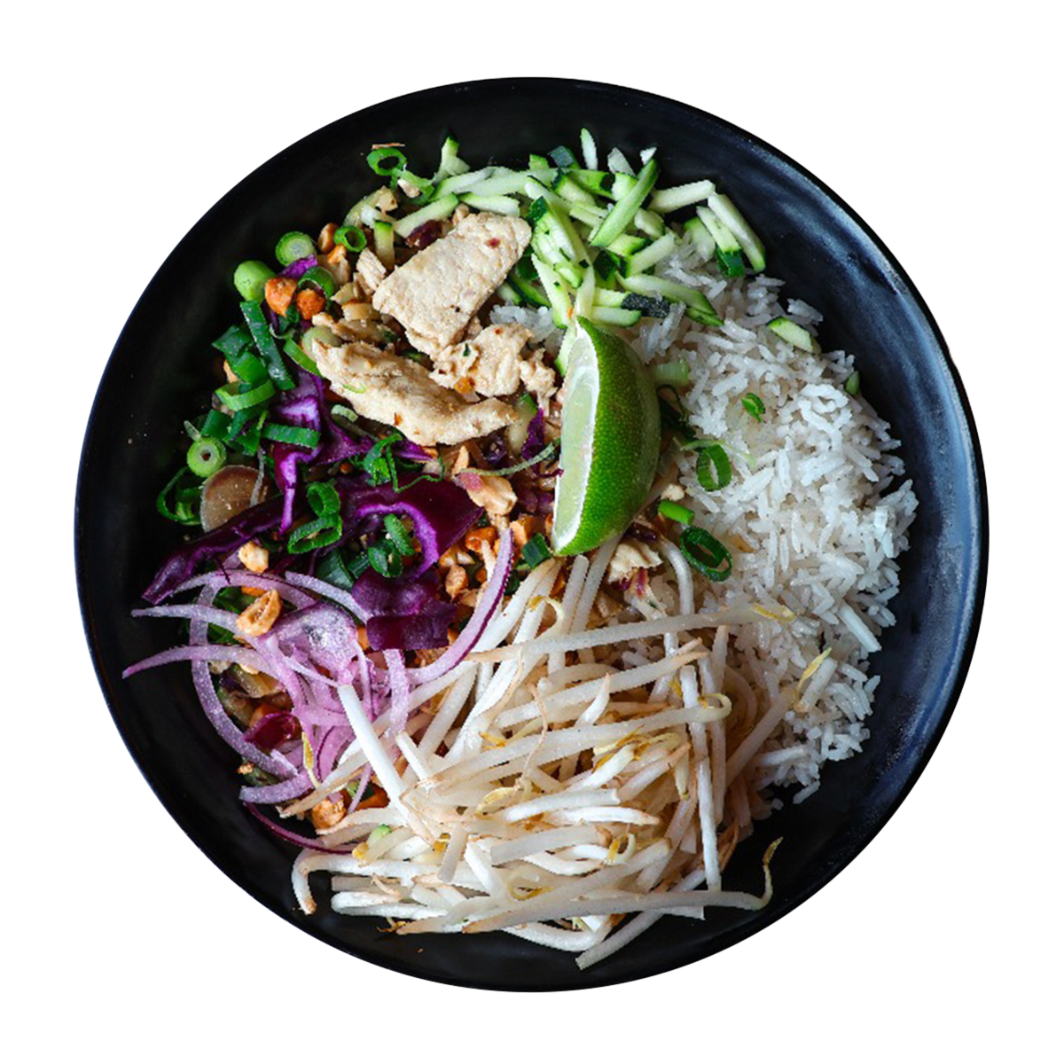 Choux rouge, Oignons rouge, courgettes, pousse de soja, cacahuètes, ciboulette, citron vert, oignons rouges sautés au wok, lait de coco et sauce satay