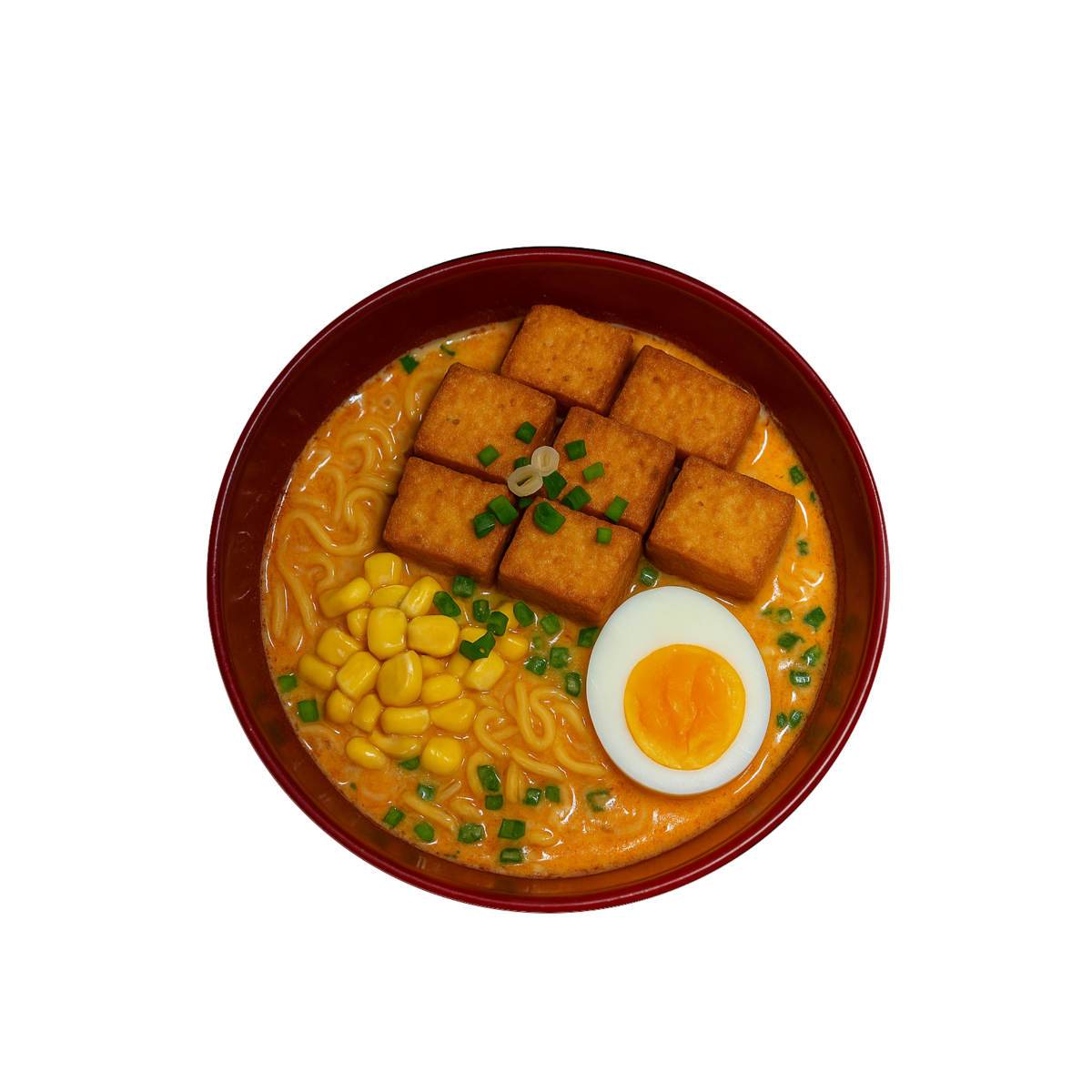 Bouillon végétarien, épices coréennes, nouilles ramen, oeuf, kimchi, pousses de soja, maïs, ciboulette thaï